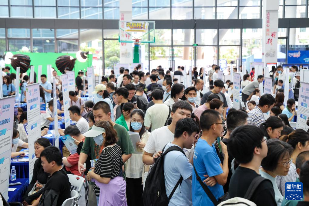5月16日,在招聘會現(xiàn)場,求職者與企業(yè)招聘人員交流。