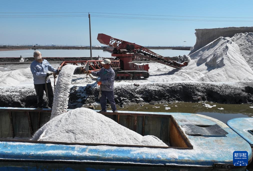 近日,河北省唐山市曹妃甸區(qū)南堡鹽場(chǎng)的35萬(wàn)畝鹽田迎來(lái)春鹽收獲期,工人利用晴好天氣加緊收獲,鹽田里處處繁忙景象。