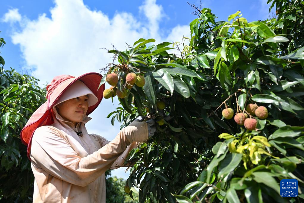 5月22日,農(nóng)民在??谑协偵絽^(qū)三門坡鎮(zhèn)采摘荔枝。