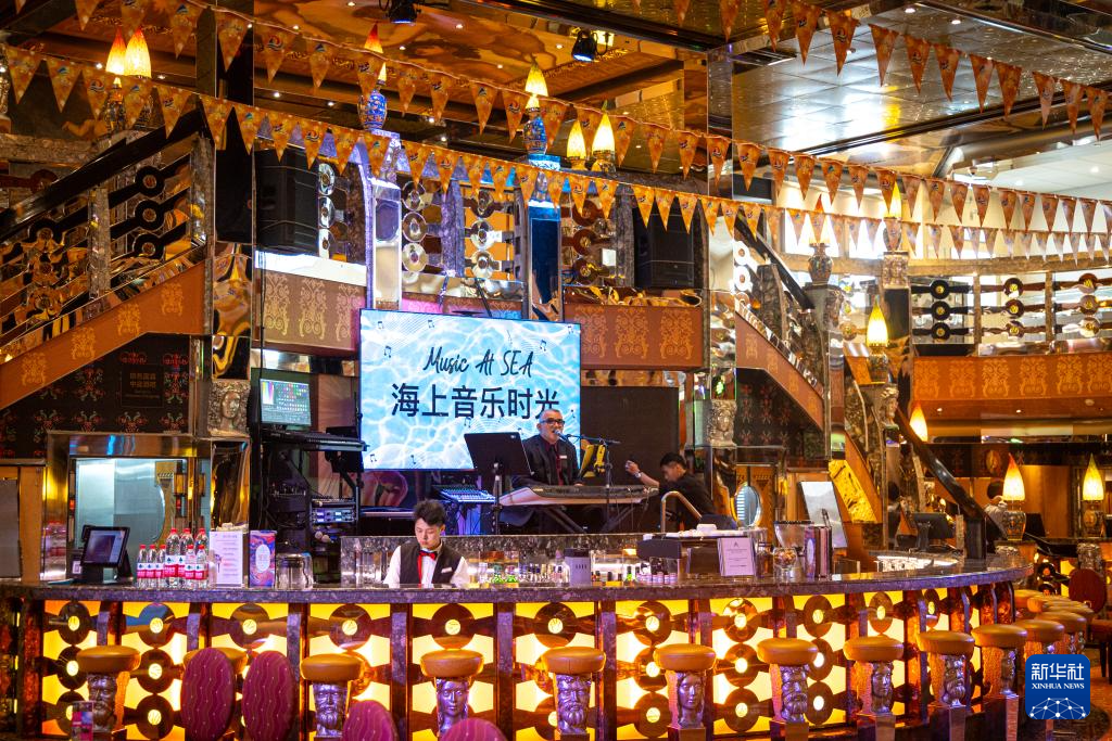 5月27日,在國際郵輪“愛達(dá)·地中海”號上,工作人員為游客演出。