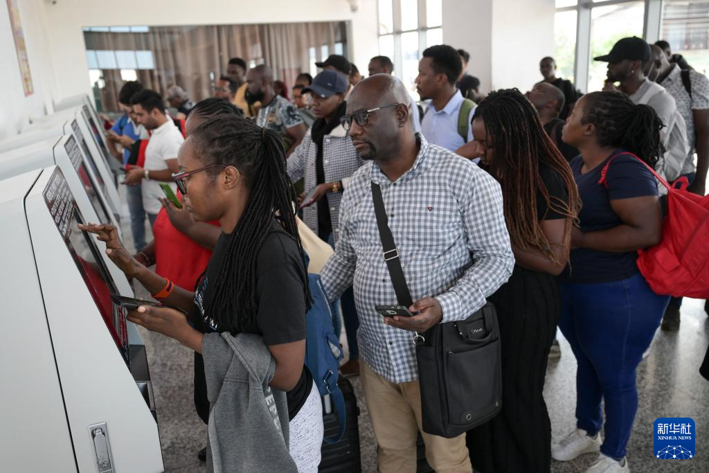 5月31日,在蒙內(nèi)鐵路內(nèi)羅畢站,乘客在自助取票機(jī)前排隊(duì)取票。