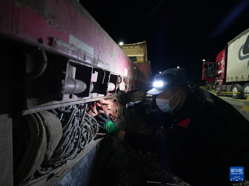 6月2日凌晨,在新疆伊爾克什坦口岸,邊檢站執(zhí)勤民警對入境車輛進行車體檢查。