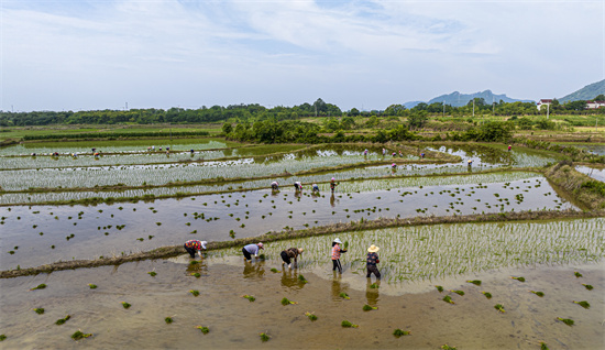 2025年6月4日,芒種時(shí)節(jié),位于安徽省合肥市廬江縣樂橋鎮(zhèn)詹店村的阮義才家庭農(nóng)場抓住晴好農(nóng)事有利天氣,正忙著組織村民在農(nóng)機(jī)難以作業(yè)的200畝高塝水田里人工栽插一季稻秧苗。