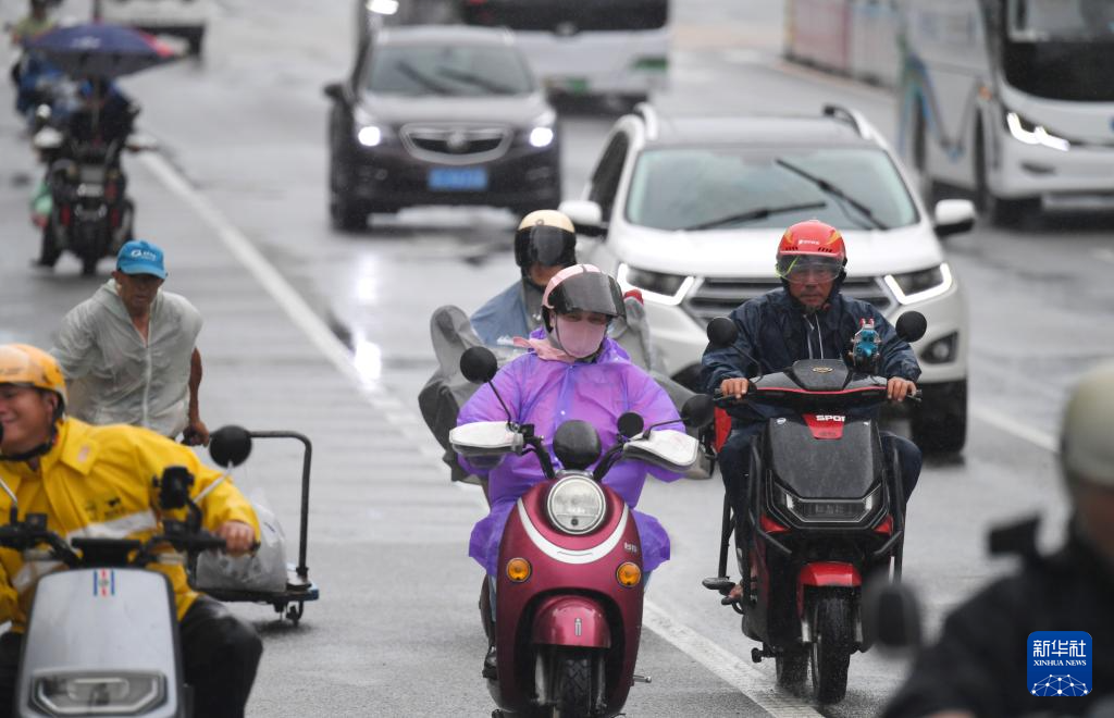 6月12日,在三亞市吉陽區(qū),市民冒雨騎行。