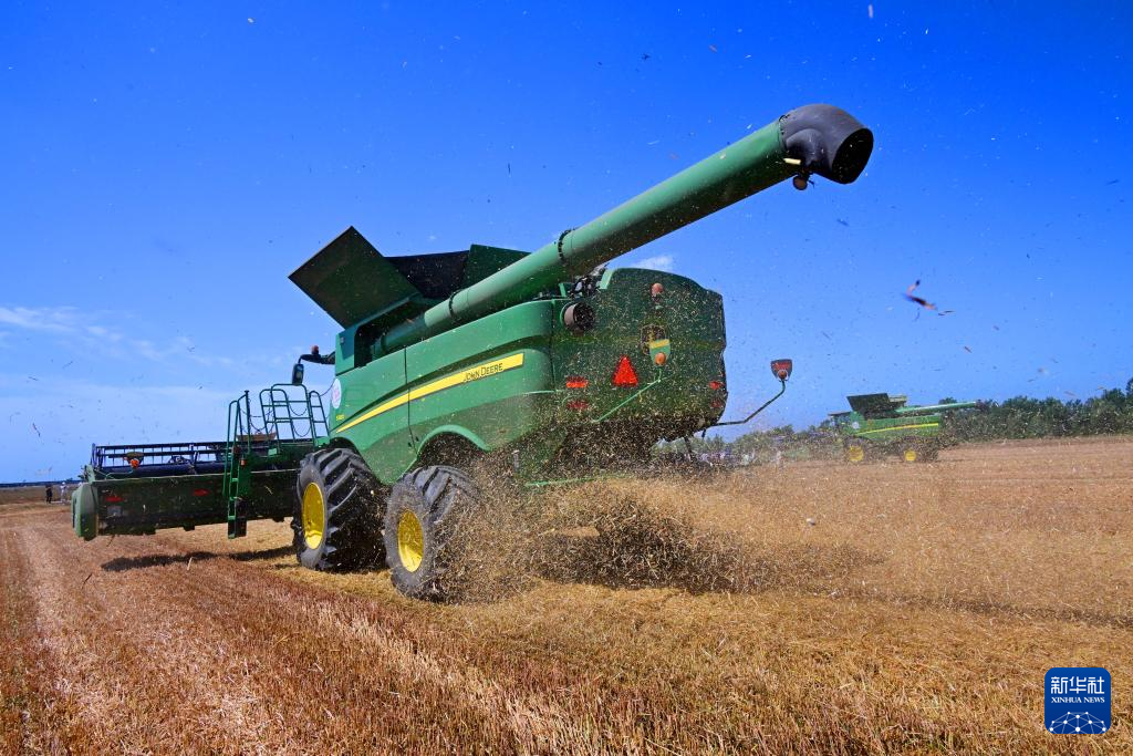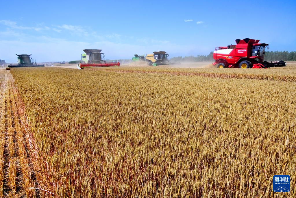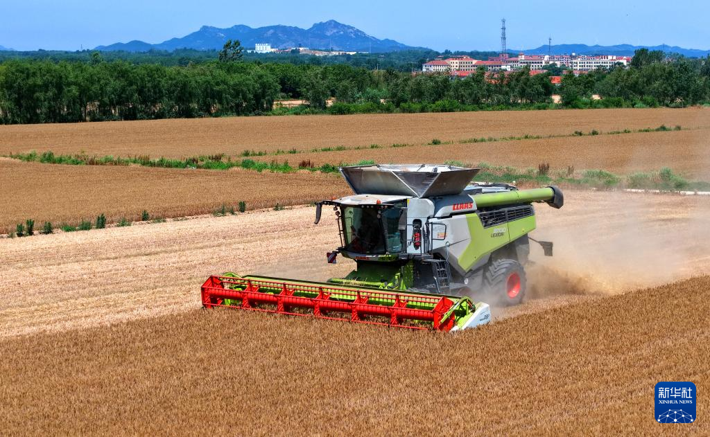 近日,山東省青島市小麥?zhǔn)斋@作業(yè)全面展開。當(dāng)?shù)剞r(nóng)業(yè)農(nóng)村部門調(diào)度6500余臺(tái)聯(lián)合收割機(jī)投入“三夏”作業(yè),多措并舉保障小麥?zhǔn)崭铐樌M(jìn)行。