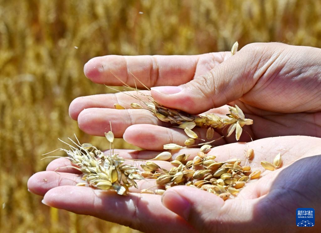 6月12日,在青島西海岸新區(qū)大場(chǎng)鎮(zhèn)的麥田里,當(dāng)?shù)剞r(nóng)業(yè)農(nóng)村部門的工作人員在查看小麥成熟度。