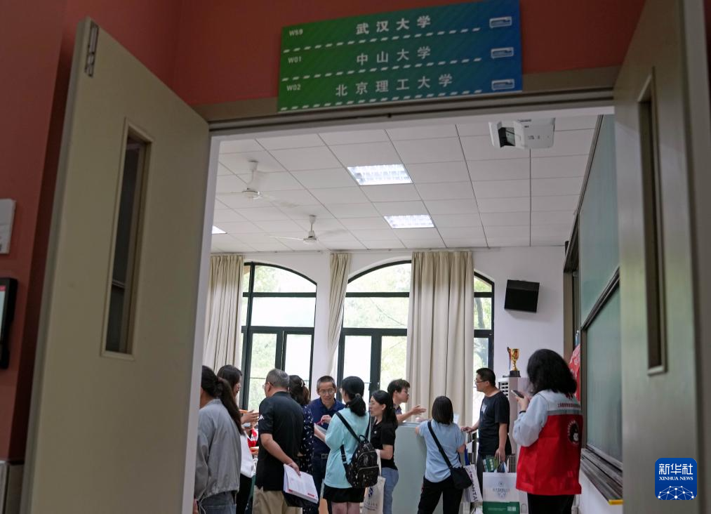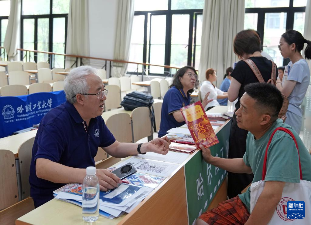 6月15日,哈爾濱工業(yè)大學(xué)的招生老師(左)與考生家長交流。