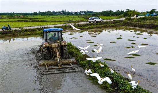 2025年6月22日,在位于安徽省合肥市廬江縣冶父山鎮(zhèn)鋪崗村下陷沖村民組的安權家庭農(nóng)場,農(nóng)機手正駕駛旋耕機翻耕農(nóng)田,數(shù)百只白鷺圍繞機械追逐覓食,勾勒出一派和諧的夏日生態(tài)田園風光圖。