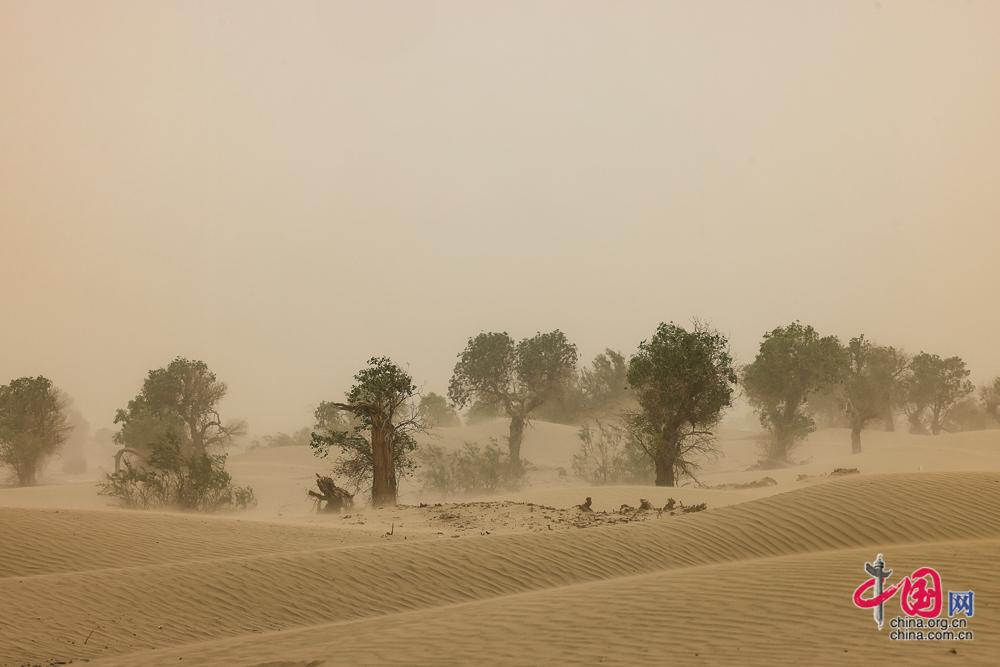 6月13日,塔克拉瑪干沙漠邊緣,有“沙漠衛(wèi)士”美譽(yù)的胡楊林在風(fēng)沙中傲然挺立。中國(guó)網(wǎng)記者 董寧 攝影