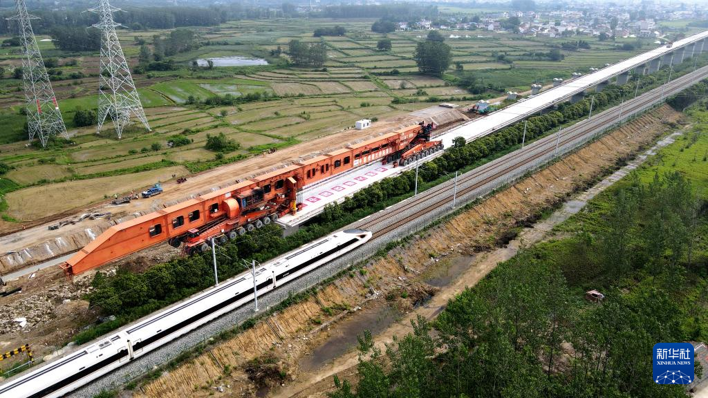 新建滬寧合高鐵安徽段站前四標(biāo)最后一榀40米箱梁完成架設(shè)(6月25日攝,無(wú)人機(jī)照片)。