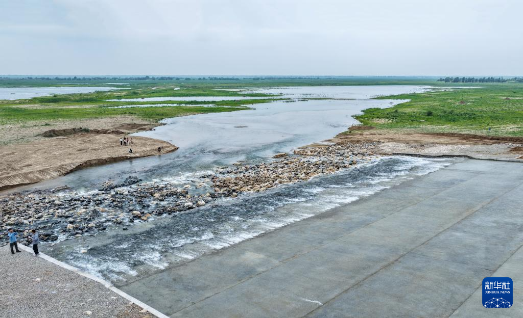 6月30日拍攝的引綽濟遼工程通遼市莫力廟水庫出水口(無人機照片)。