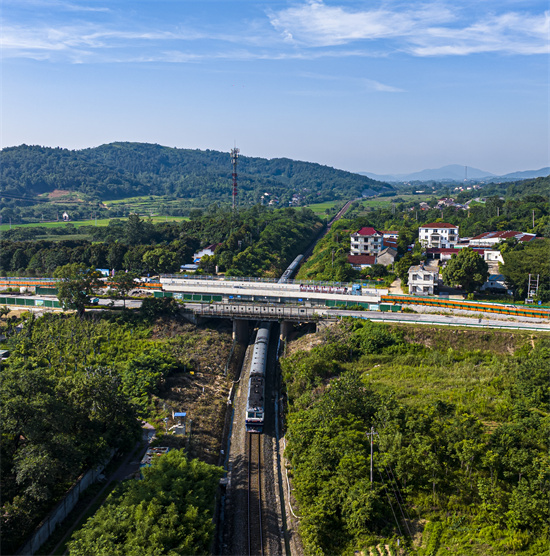 2025年7月5日,一列客運火車穿過安徽省合肥市廬江縣萬山鎮(zhèn)境內(nèi)二軍公路上跨合九鐵路改擴建工程橋孔
