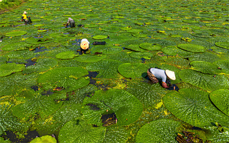 芡實又名“雞頭米”,具有較高的營養(yǎng)及藥用價值。近年來,廬江縣充分發(fā)揮楊柳圩豐沛的水鄉(xiāng)資源優(yōu)勢,鼓勵農(nóng)民種植水生滋補植物芡實。該縣芡實種植面積達(dá)2.4萬余畝,僅此一項當(dāng)?shù)剞r(nóng)民每年進賬可達(dá)7000多萬元。 (巢志斌 攝)