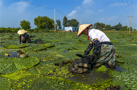 2025年8月14日,在安徽省合肥市廬江縣白湖鎮(zhèn)吳渡村,年年旺蔬菜專業(yè)合作社抓緊晴好天氣,正組織村民在大田里搶收水生植物芡實。