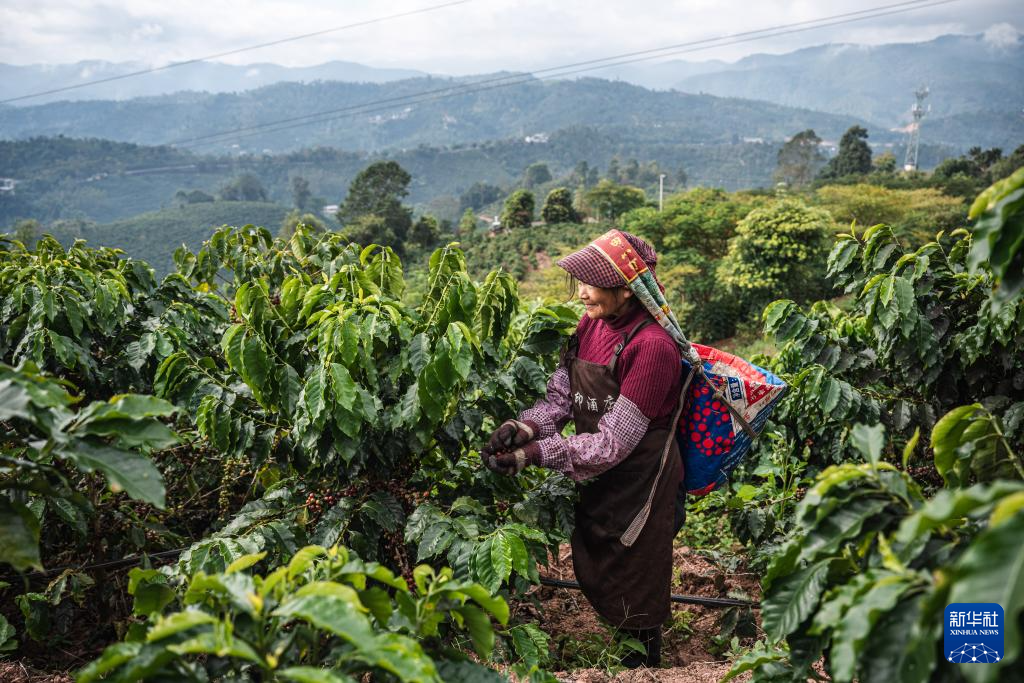 12月6日,農(nóng)民在云南省普洱市一處咖啡田采摘咖啡鮮果。