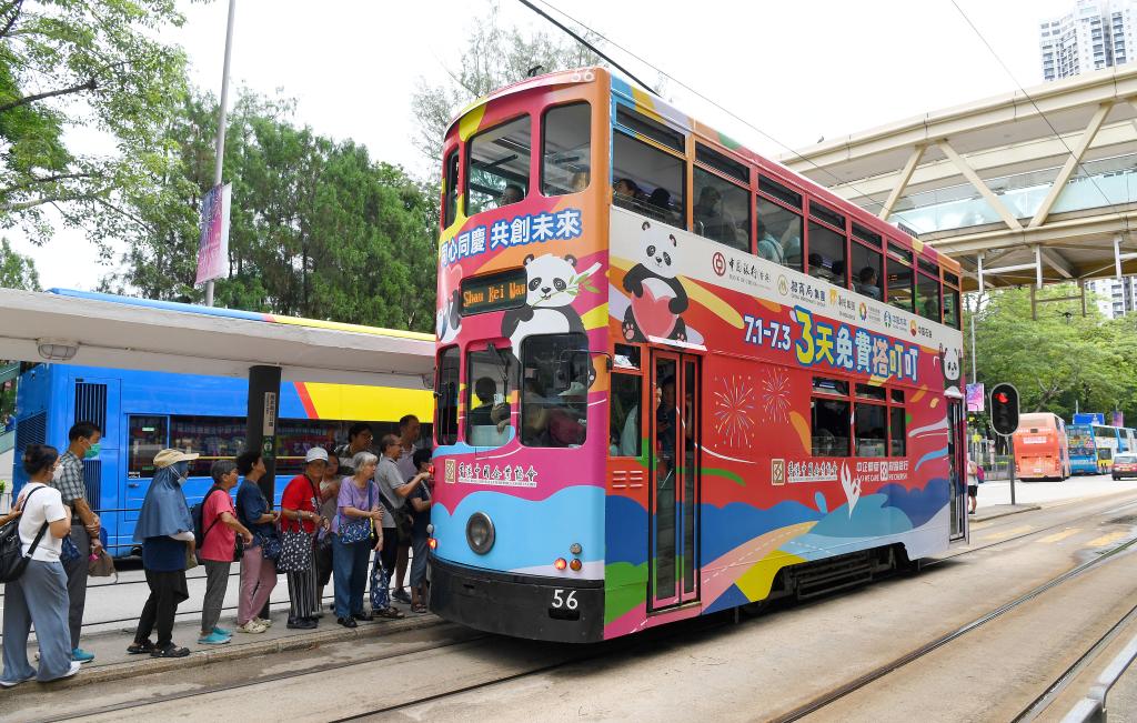 7月1日,人們在香港街頭排隊搭乘一輛涂裝“3天免費搭叮叮”宣傳海報的電車。新華社記者 陳鐸 攝