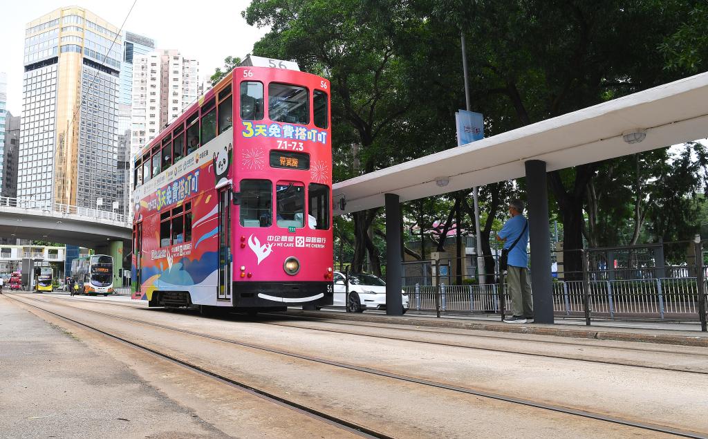 7月1日,一輛涂裝“3天免費搭叮叮”宣傳海報的電車從香港街頭駛過。新華社記者 陳鐸 攝