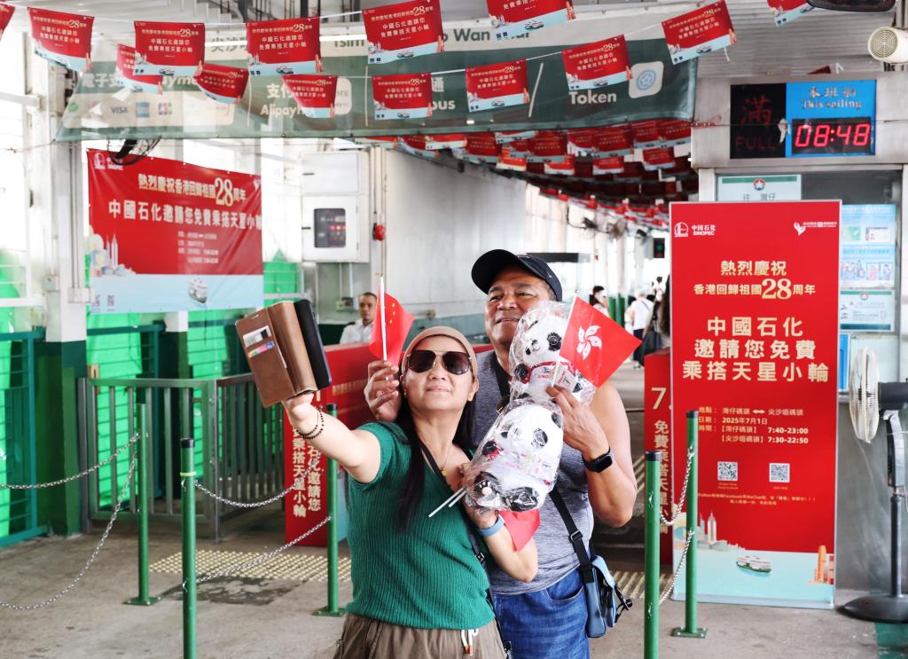 7月1日,在香港天星小輪尖沙咀碼頭,市民在中國石化推出的“慶祝香港回歸祖國28周年免費乘坐日”主題活動中留影。新華社發(fā)