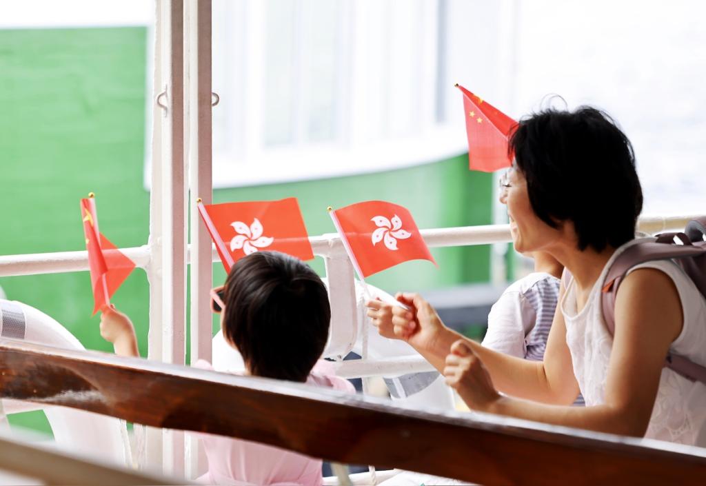 當天一早,維多利亞港涌動著喜慶氣氛。海濱長廊游人如織,不少市民手持國旗與特區(qū)區(qū)旗,在海風中揚起片片“紅浪”。