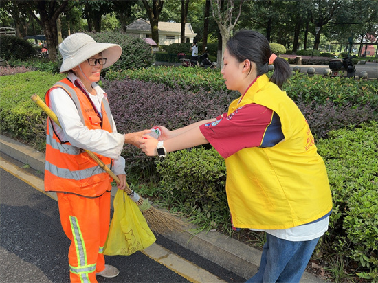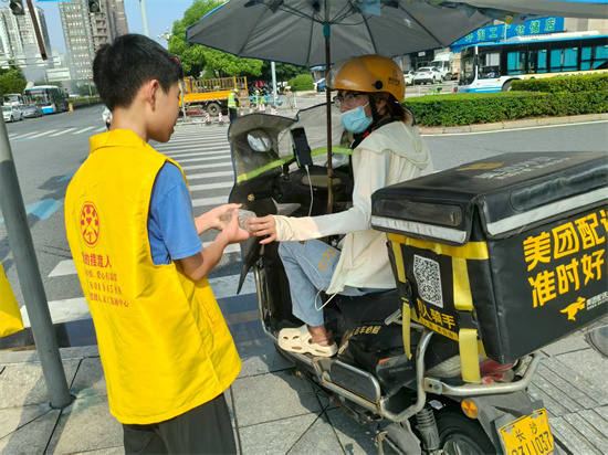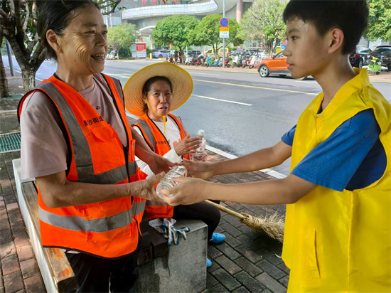 8月1日,小義工們走上街頭,他們熱情地將一瓶瓶飲用水送到正在高溫下辛勤工作的環(huán)衛(wèi)師傅、外賣(mài)小哥、園林工人和快遞員等戶外工作者手中,同時(shí)送上一句:“您辛苦了!太陽(yáng)下熱浪撲面,小義工們汗水浸濕衣背,他們用實(shí)際行動(dòng)傳遞關(guān)懷,在勞動(dòng)中深刻體會(huì)到酷暑中室外工作的艱辛與奉獻(xiàn)的可貴,致敬這群默默守護(hù)在一線崗位的平凡英雄們。