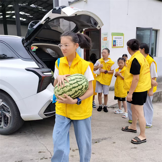 “叔叔阿姨,你們是最美的環(huán)境美容師,辛苦了!請(qǐng)吃西瓜!”小小義工們簡(jiǎn)單的話語(yǔ)讓環(huán)衛(wèi)師傅們倍感溫暖。在田漢社區(qū),50歲環(huán)衛(wèi)師傅楊檢接過(guò)切好的西瓜和防暑物資時(shí)連連道謝:“你們送過(guò)來(lái)的西瓜真好吃,這些物品還都很實(shí)用,我們心里頭也涼快多了!”