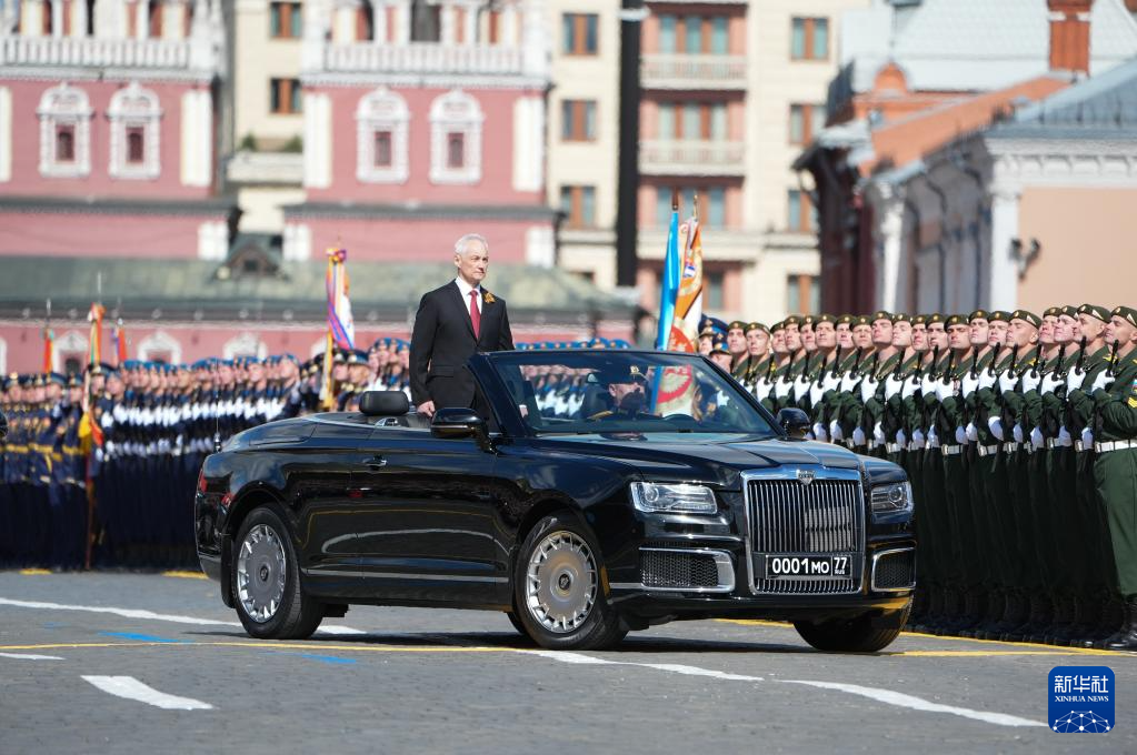 5月9日,在俄羅斯首都莫斯科,俄羅斯國防部長別洛烏索夫(中)在紀念蘇聯(lián)偉大衛(wèi)國戰(zhàn)爭勝利80周年閱兵式上檢閱部隊。