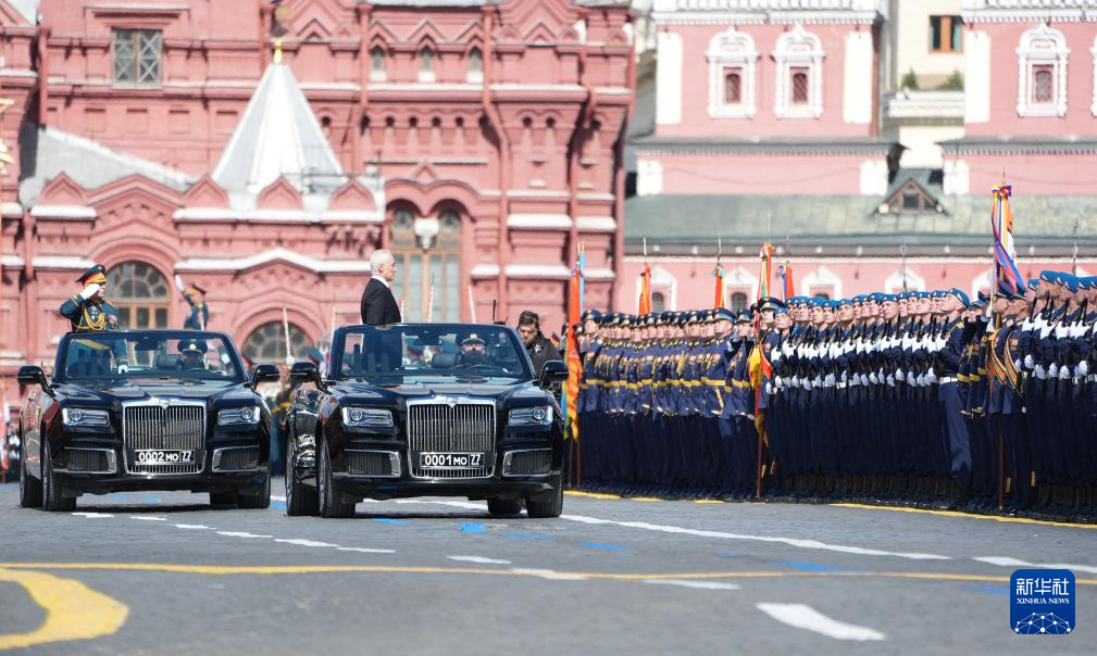 5月9日,在俄羅斯首都莫斯科,俄羅斯國防部長別洛烏索夫(前右)在紀念蘇聯(lián)偉大衛(wèi)國戰(zhàn)爭勝利80周年閱兵式上檢閱部隊。