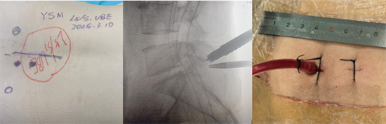 患者陽(yáng)某某,女,50歲,因反復(fù)腰部疼痛7年加重,并右下肢疼痛麻木半月到衡南縣人民醫(yī)院就診。骨科二區(qū)主任陳軾接診了患者,門診MRI檢查發(fā)現(xiàn)陽(yáng)女士為典型L5/S1巨大椎間盤(pán)脫出并壓迫神經(jīng)根,保守治療無(wú)效,建議手術(shù)治療。苗驚雷教授與縣醫(yī)院骨科二區(qū)專家團(tuán)隊(duì)為陽(yáng)女士量身定制了無(wú)需內(nèi)固定、創(chuàng)傷更小的UBE微創(chuàng)手術(shù)方案。術(shù)中通過(guò)兩個(gè)7mm的切口,精準(zhǔn)摘除脫出髓核,徹底解除神經(jīng)壓迫。術(shù)后次日,陽(yáng)女士下肢癥狀顯著緩解,已可自主下床活動(dòng)。