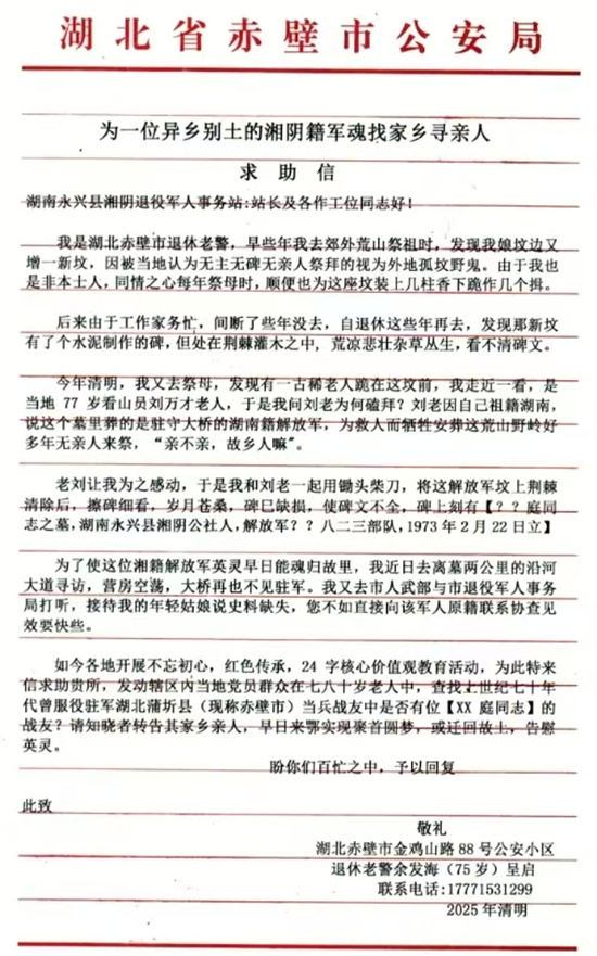 中國新報訊(記者 葉亞山)在湖北赤壁的荒山上,一座沉寂多年的烈士墓,承載著一段被時光塵封的英雄往事。近日,75歲的退休老警余發(fā)海向湖南永興縣湘陰退役軍人事務(wù)站寄出一封特殊的求助信,揭開了一場跨越半個世紀(jì)的“尋親”故事。