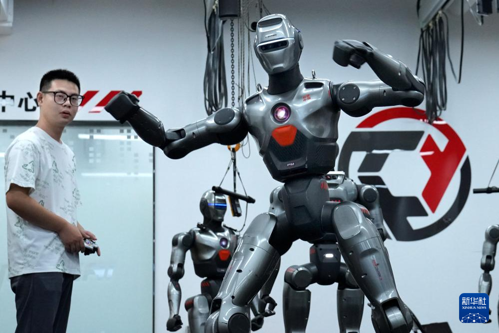 6月25日,在深圳市眾擎機器人科技有限公司,人形機器人揮舞手臂致意。