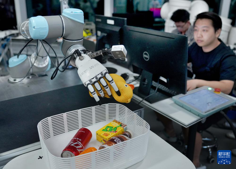 6月25日,工作人員在廣東省具身智能機器人創(chuàng)新中心操控機器人抓取物品。