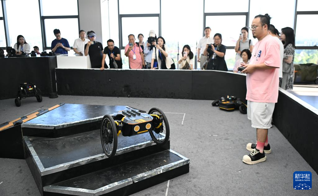 6月23日,在廣東東莞松山湖XbotPark機器人基地,本末科技工作人員操作機器人爬樓梯。