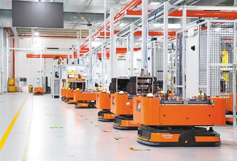 7月21日,位于金山區(qū)的特百佳動力科技股份有限公司芯工廠內,AGV自動搬運車排列整齊。該公司自動變速箱產線全線采用AGV無人化運輸。