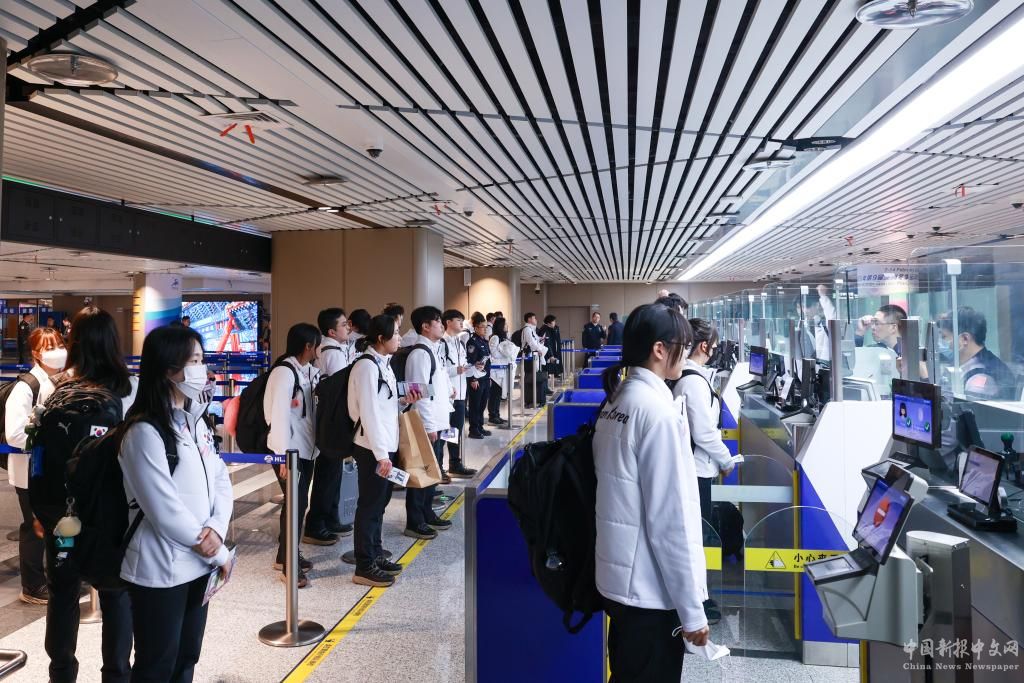 2月1日,韓國代表團(tuán)成員在亞冬會(huì)專用通道辦理入境相關(guān)手續(xù)。新華社發(fā)(韓睿 攝)