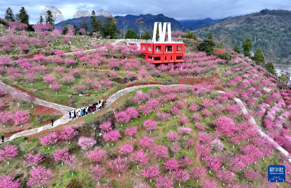 3月4日,游客在湖北省宣恩縣珠山鎮(zhèn)賞花游玩(無人機(jī)照片)。