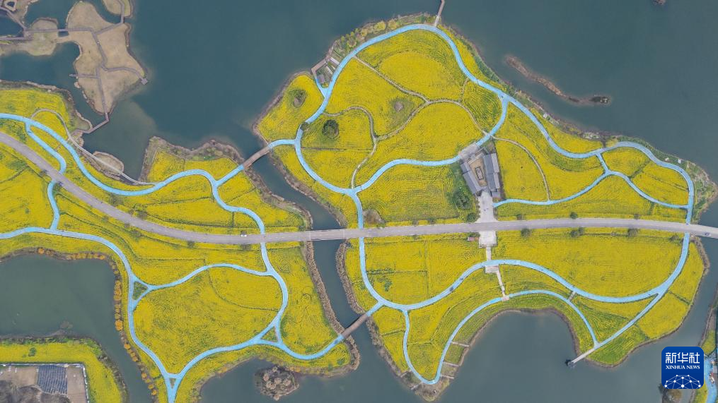 3月3日在四川省眉山市彭山區(qū)五湖四海濕地公園拍攝的油菜花海(無人機(jī)照片)。