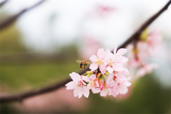 綻放的櫻花引來蜜蜂翩翩舞動,宛如一幅美麗的畫卷。(周冬梅 攝)