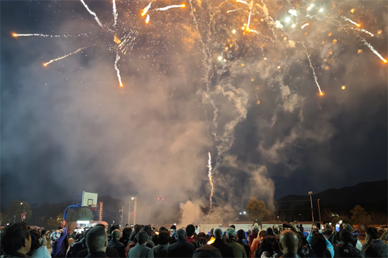 華燈初上,一場(chǎng)篝火晚會(huì)在華山村文體廣場(chǎng)拉開(kāi)帷幕,少數(shù)民族舞蹈、湊數(shù)字游戲、煙花秀等主題活動(dòng)精彩紛呈,主持人現(xiàn)場(chǎng)教授2個(gè)少數(shù)民族舞蹈讓游客0基礎(chǔ)更快更簡(jiǎn)單的加入歡樂(lè)的氛圍中,眾多親子家庭踴躍報(bào)名參與,活動(dòng)現(xiàn)場(chǎng)趣味橫生。最后,活動(dòng)在一片璀璨的煙花秀中閉幕,上萬(wàn)名游客現(xiàn)場(chǎng)盡享視覺(jué)盛宴,火樹(shù)銀花閃耀著華山村的夜空。