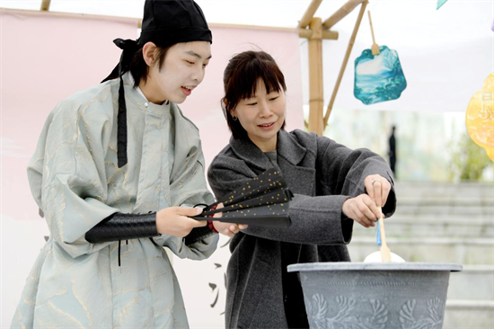 千畝梨園景區(qū)內(nèi),游人如織,游客們或忙著賞花拍照打卡,留下美好瞬間;或徒步穿越花海,享受春日美好時光;十二花神盛裝出行,與千畝梨花交相輝映,恍若穿越至古代花朝,體驗一場浪漫與莊重并存的春日盛典;很多游客與NPC“李白”“李清照”共赴詩詞之約,感受“對詩”的樂趣。一位游客一邊用手機拍照,一邊跟筆者說,今天本來是約著家人到梨園拍梨花,沒想到還享受了一場高質(zhì)量的文藝活動,梨花節(jié)不僅讓“金甲脆梨”名聲遠播,同時也拉動了珠暉鄉(xiāng)村旅游業(yè)的發(fā)展。“我要記錄下這個春日的美麗瞬間,讓自己的朋友圈也溢滿梨花的清香。”