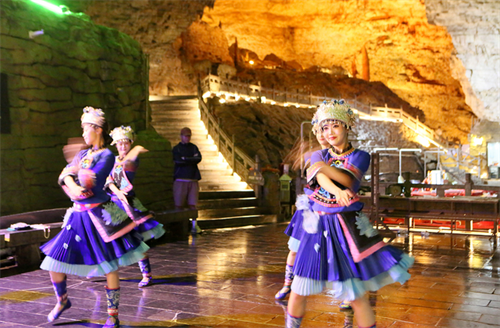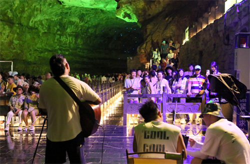 “洞內(nèi)涼爽如春,奇妙的光影、美妙的音樂與自然美景完美的融合在一起。”來自廣東的楊先生感嘆道:“在億萬年的溶洞中聆聽音樂,觀看非遺表演,仿佛穿越時(shí)空與地球?qū)υ?,這種體驗(yàn)非常奇妙!”