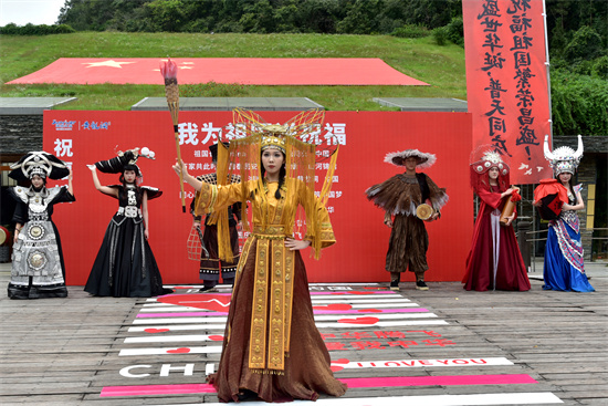 各族人民心向黨,共筑美好中國(guó)夢(mèng)!上午九時(shí)許,一場(chǎng)別開(kāi)生面的民族特色時(shí)裝秀拉開(kāi)了“我為祖國(guó)送祝福”主題活動(dòng)的序幕。只見(jiàn)當(dāng)?shù)氐纳贁?shù)民族模特身著充滿民族特色和時(shí)尚元素的盛裝,邁著自信陽(yáng)光的步伐走在祝福墻前,向游客展示當(dāng)?shù)赝良易?、苗族的豐富多彩的服飾文化,展示健康美好的形象和幸福美滿的生活。隨后,模特們和現(xiàn)場(chǎng)游客一起揮舞紅旗高唱“我愛(ài)你,中國(guó)!”,用激情的歌聲表達(dá)對(duì)祖國(guó)的熱愛(ài)。