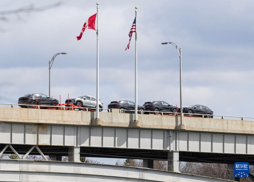4月9日,在加拿大安大略省尼亞加拉瀑布市加美邊境地帶,一輛滿載的汽車運(yùn)輸車通過(guò)劉易斯頓-昆斯頓橋開(kāi)往加拿大。