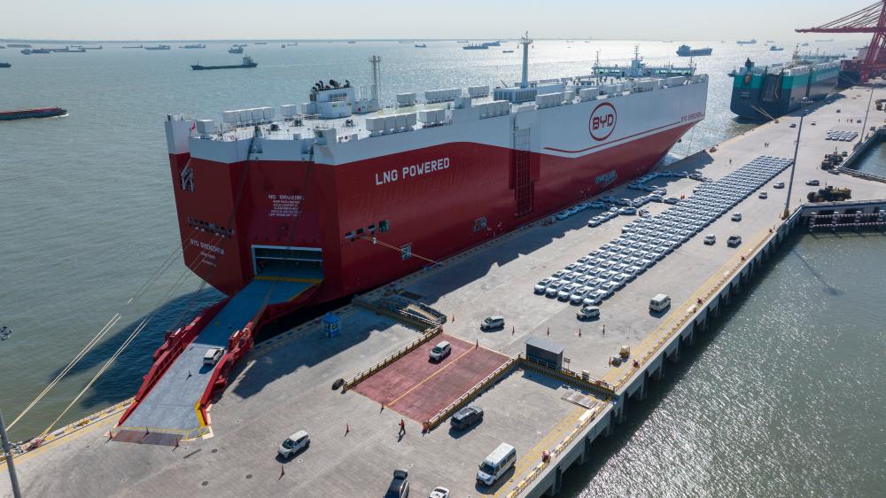 出口汽車在蘇州港太倉港區(qū)碼頭集中裝載上“深圳號(hào)”汽車運(yùn)輸船(2025年4月26日攝,無人機(jī)照片)。新華社發(fā)(王須中攝)