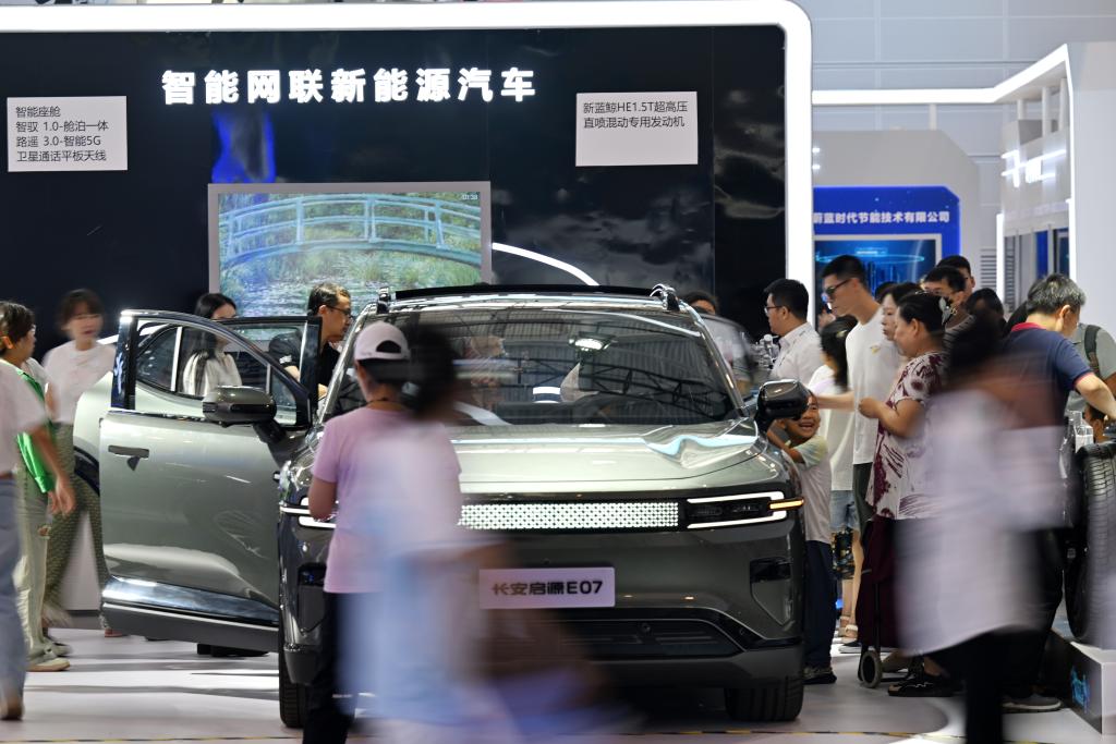 觀眾在天津舉行的2024世界智能產(chǎn)業(yè)博覽會(huì)上的長(zhǎng)安汽車展臺(tái)參觀(2024年6月22日攝)。新華社記者 李然 攝