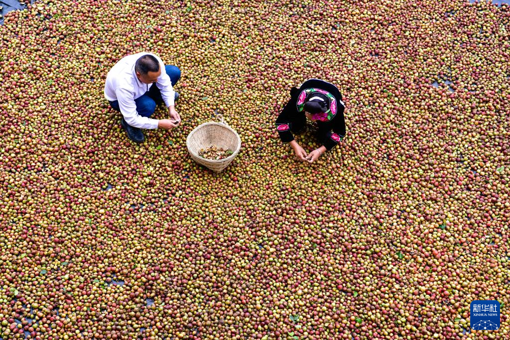吳光榮(左)與村民在貴州省龍里縣頤光山林油茶生態(tài)園里晾曬油茶果(2024年10月15日攝)。
