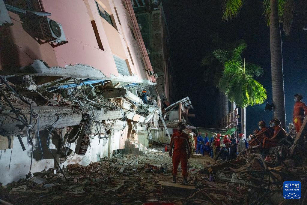 3月30日,在緬甸曼德勒,中國救援隊隊員在長城飯店開展救援。