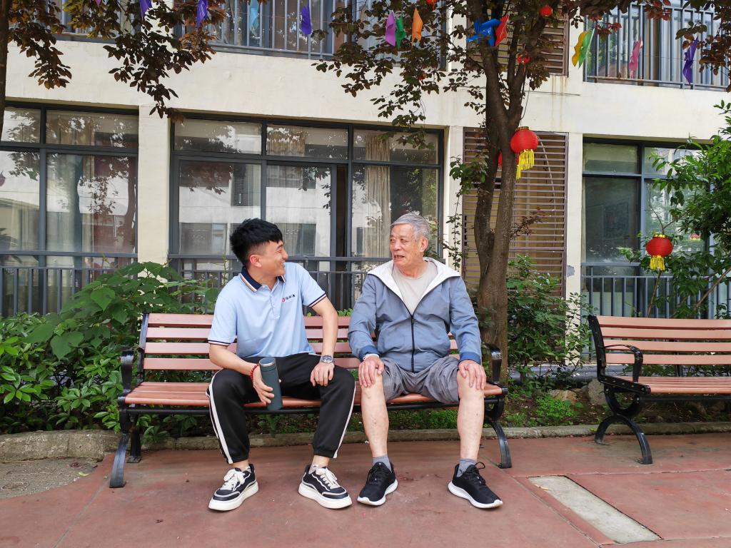 5月9日,陳勝(左)在貴州省貴陽市觀山湖區(qū)養(yǎng)老服務(wù)中心與老人交流。新華社記者 吳思 攝