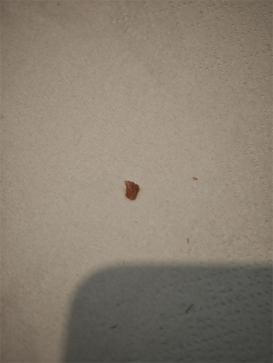 11月29日晚上9時(shí)48分,陳樹在長(zhǎng)沙河西王府井商場(chǎng)一樓野人先生點(diǎn)了山楂冰淇淋,才吃兩口感覺咬到一個(gè)小石頭,舌頭也被堅(jiān)硬的東西刺痛了,吐出來發(fā)現(xiàn)一個(gè)約0.4公分左右的半透明物體,疑似是砂石(如圖)。