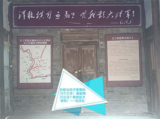 仔細(xì)看完墻上的宣傳展示,才總算明白過來,原來,90年前的1935年3月底,在中央紅軍四渡赤水后的南渡烏江前夕,紅三軍團(tuán)軍團(tuán)長彭德懷,政委楊尚昆,政治部主任劉少奇,參謀長葉劍英,第十一團(tuán)政委張愛萍,第十三團(tuán)團(tuán)長彭雪楓,以及直屬收容隊隊長胡耀邦等紅三軍團(tuán)領(lǐng)導(dǎo)人,都曾在石柜臺住過。