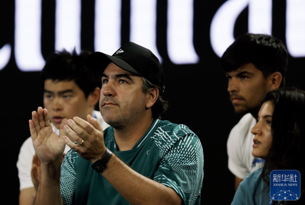 鄭欽文的教練丹特·博蒂尼(中)在場邊觀賽。新華社記者 馬平 攝